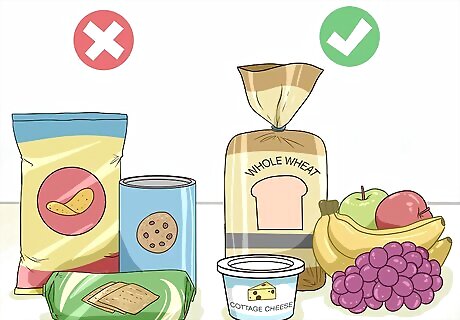 Eliminate junk foods and other tempting items from your home. If you have lots of unhealthy foods in your pantry and refrigerator, it will be much easier to eat out of stress. Take a look at what you have and try to weed out some of the unhealthy items. Donate any unopened canned goods and other packaged foods to a soup kitchen if you don’t want them to go to waste.For example, if you have bags of potato chips, cookies, and crackers in your pantry, get rid of them and replace them with healthy snacks, such as whole fruit, low-fat cheese, and whole wheat bread.If you share a home with other people, then you might ask to designate 1 cupboard and shelf of the fridge as yours and fill it up with healthy foods.