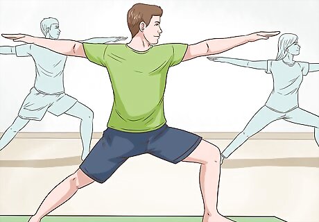 Try yoga as a way to relax and burn calories. Yoga is an effective way to reduce stress and it can also help to tone your body and increase the number of calories you burn each day. Try doing a beginner’s yoga video or class if you’ve never tried yoga before. There are specific poses you can try to help boost your weight loss, such as: Boat pose Warrior II Pose Four-limbed staff pose Forward bend pose