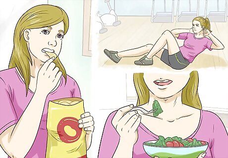 Do push ups when you’re feeling stressed. Doing push ups can help to speed up your body’s processes that flush the stress hormone called cortisol out of your body. If you’re feeling stressed and tempted to eat something unhealthy, get down on the floor and do as many push ups as you can. If you can’t do push ups, try doing another type of exercise that works a large muscle group, such as squats, lunges, or sit ups.