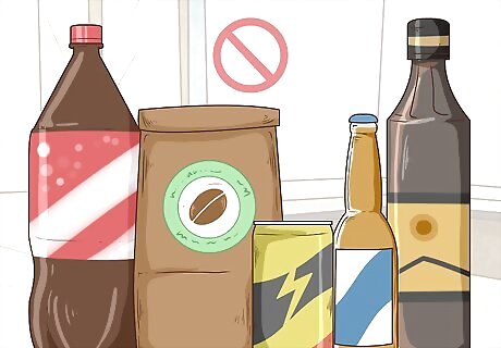 Reduce your consumption of sugary, alcoholic, and caffeinated beverages. Reduce the number of sugary beverages you drink such as sodas and artificially sweetened fruit drinks. Since caffeine can increase your blood pressure, limit your consumption of fully caffeinated drinks like coffee and tea. Have no more than 1 alcoholic drink each day for women, or 2 for men. Aim to drink about 8 glasses of water each day instead. To make these drinks easier to stay away from, don’t buy them at the grocery store. This way, you won’t be tempted. Avoid alcoholic beverages altogether if you can since they can increase your blood pressure and cause weight gain.