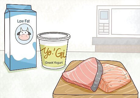 Choose lean and low-fat options. Swap in low-fat dairy products like milk and yogurt for their full-fat counterparts. Consume more lean proteins like fish and legumes instead of fatty proteins. Avoid processed foods containing trans fats, and check the nutrition labels to reduce your consumption of saturated fats. Trim the fat off of pork chops, purchase lean ground beef, and remove the skin from poultry before cooking it to make these proteins leaner. Products that often contain trans fats include baked goods, fried fast food, margarine, and vegetable shortening.