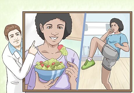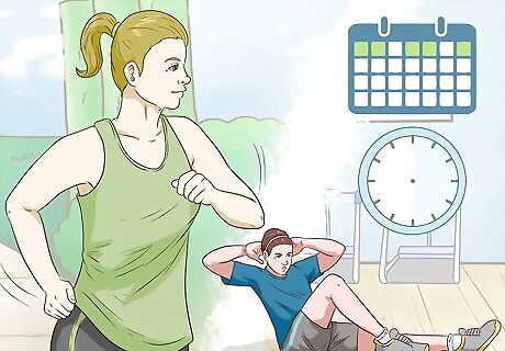 Exercise for about 2.5 hours each week. Aim to complete at least 2.5 hours of physical activity at a moderate intensity each week. This equates to roughly 30 minutes of exercise each weekday. Try going for a brisk walk or jog, bicycling, swimming, or attending a dance-inspired fitness class. If you prefer high-intensity workouts, try something involving interval training that alternates between intense bursts of activity and strength training. Note that your blood pressure might increase if you stop working out regularly. Find an exercise routine that works for your schedule so it’s easier to keep up.