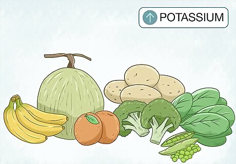 Increase your potassium consumption. Potassium works to decrease the impact of sodium on your blood pressure, so focus on working more high-potassium foods into your diet. Choose fresh fruits like bananas, oranges, and melon or try dried fruits such as prunes, dried peaches, dried apricots, and raisins. Drink orange juice and eat cooked spinach and broccoli. Munch on leafy greens, potatoes, and peas. Start with potassium-rich foods before turning to potassium supplements. High levels of potassium can cause acute cardiac arrhythmia, so talk to your doctor about testing your potassium levels to see if you need to take a supplement.