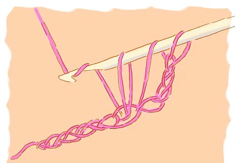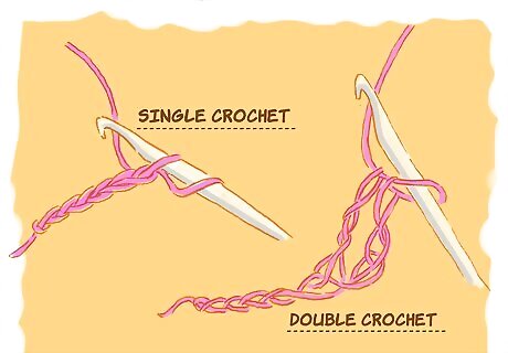 To make a single crochet stitch, wrap the end of the yarn around the hook. Start behind the hook and come over the hook and then draw it underneath. For a double crochet, insert the hook under the fourth loop from the hook. Yarn over the hook and pull it through the center of the chain. Then yarn over the hook and draw the yarn through the first two loops from the hook. Repeat for the last two loops on the hook.