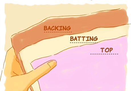 Baste the quilted squares, batting, and backing together. Sew the three layers together with a simple stitch in each corner of the quilt. You will remove this stitch later. Fusible batting needs to be ironed to the other two layers, but regular batting does not.