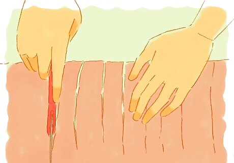 Cut the 4-inch section into strips any thickness you want using your scissors or rotary cutter. Usually 1-inch strips are used. Only cut to just below the tape measure line.