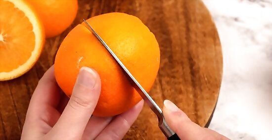 Cut the orange on the cutting board. Use the paring knife to slice into the peel of the orange. Insert only as far as the pith, taking the knife around the middle of the orange, going all the way around the circumference.