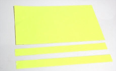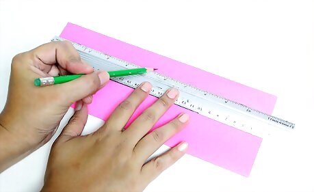 Cut two 1 inch (2.54 centimeter) wide strips from the long edge of the yellow paper. Place the yellow paper down on the table in front of you, so that one of the long edges are parallel to the edge of the table. Use your ruler and pencil to draw two strips along the long edge of the paper. Cut those strips out with a pair of scissors. Set the two strips aside.