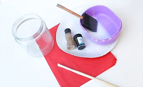 Gather your supplies. This lantern is a little bit different from the rest. You can't hang it anywhere, because it is made from glass. You can, however, use it as a real candleholder. Try not to get it wet, however; you can wipe it clean with a damp cloth, but if you leave it sitting in water, the Mod Podge will flake off. Here's what you'll need to make this lantern: Short, squat jar Red tissue paper Mod Podge Paintbrush or foam brush Paper plate or palette Scissors Black paint Gold glitter, glue, sequins, markers, etc (optional)
