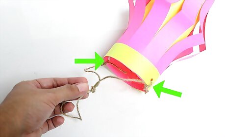 Attach the string to the lantern. Use a hole puncher to poke two holes into the top of the lantern. Make sure that they are straight across from each other. Thread a long piece of string through both of the holes, and tie the ends together in a tight knot.
