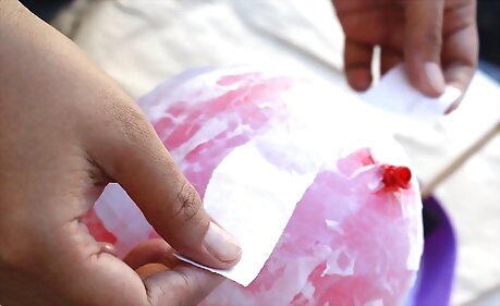 Pop the balloon and pull it out through the hole. This is now the top of your lantern. If the lantern caves in on itself, simply reach inside, and pop it back out into shape. At this point, you can also use some scissors to clean up the edges of the tissue paper.