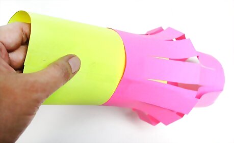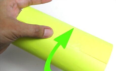 Roll the yellow paper into a tube and secure it. Take the two short sides of the yellow paper, and bring them together to form a tube. Overlap them by 1 inch (2.54 centimeters) and secure them. You can use glue, tape, or a stapler. Set the yellow tube aside.
