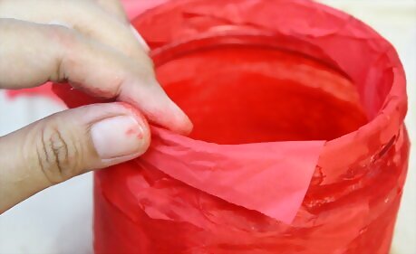 Cover the entire jar with tissue paper, including the neck. Use your fingers or your paintbrush/foam brush to smooth the paper down so that you don't get any wrinkles. Try not to overlap the tissue paper too much, or the light won't shine through as well. It's okay if the tissue paper extends past the neck. You want the next to be covered, so that the paint will have something to stick to.