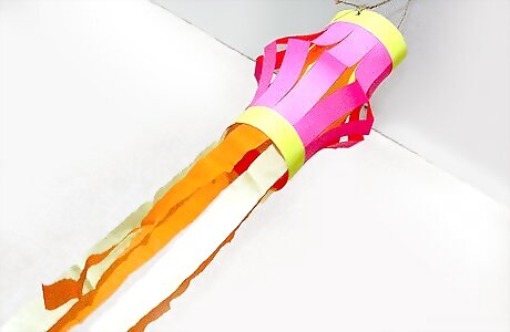 Decorate the lantern. You can hang your lantern up now, or you can decorate it further. Try not to add too many decorations, however, or your lantern will become too heavy. Here are some ideas to get you started: Cut strips of crepe paper or party streamers. Glue them to the inside of the bottom edge of the lantern. Try alternating red and yellow colors. Draw some designs along the top and bottom edge of the lantern using glue, and then sprinkle gold glitter over the designs. You can also use a gold marker. Glue some sequins or rhinestones along the top and bottom edge of the lantern.