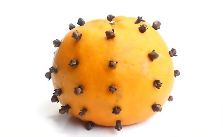 Press whole, dried cloves into an orange for a rustic touch. You can stick the cloves randomly, or you can create patterns, like stripes. Keep the cloves ⁄2 to 1 inch (1.3 to 2.5 cm) apart for a nice, full look. For a fancier orange, wrap some thin red or gold ribbon around the orange first. Secure it to the orange with double-sided tape.