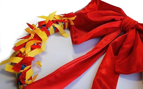 Tie pieces of ribbon around a Styrofoam ring to a simple wreath. Purchase a Styrofoam wreath base in your desired size, then wrap and tie pieces of ribbon around the wreath until it is all covered and you can't see the Styrofoam anymore. Tie a longer piece of ribbon to the top of the wreath to make a hanging loop. Ribbon with a matte finish, like burlap, gingham, and grosgrain will look the best. Choose festive colors, like red, white, and green. The wider your ribbon pieces are, the fewer you will need. Something that is around 1 to 1 ⁄2 inches (2.5 to 3.8 cm) wide would work great. Make sure that the knots are all on the outside of the wreath. Cut the ends of the ribbon down so that they are about 2 to 3 inches (5.1 to 7.6 cm) long. Cut V-shaped notches into the ends to make them look nicer.