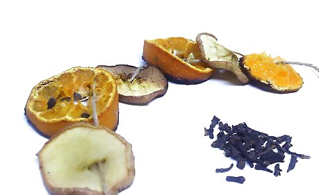 Dry slices of apple and oranges in the oven. Cut an apple and an orange into thin slices. Bake the fruit at 285 °F (141 °C) for 45 to 60 minutes, turning it once halfway through. Use a needle to thread the fruit onto string to make garlands or ornaments. The slices should be no thicker than ⁄8 inch (0.32 cm). Cut the fruit horizontally across the equator. Do not peel the fruit or cut it into wedges. Make the ornament or garland more festive by adding cinnamon sticks. Wrap and tie the string around the sticks instead of piercing them with a needle.