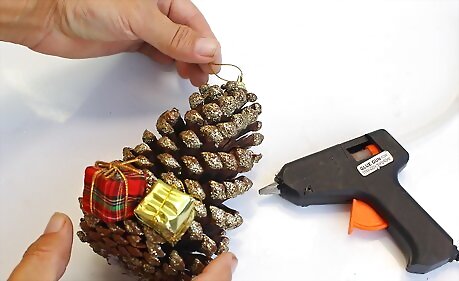 Paint and decorate pinecones to look like Christmas trees. Find a pinecone and clean it with water. Let it dry, then paint it green with acrylic paint. Use hot glue to secure "ornaments," such as sequins, mini pompoms, and large beads. Tie a loop of thread to the top of the pinecone so that you can hang it. Wrap a gold chain or pipe cleaner around the pinecone to make garlands. Draw small, colorful dots with puffy paint to make Christmas lights.