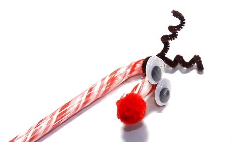 Make a reindeer with a candy cane and craft items. Hot glue a mini pompom to the short, hooked end of a candy cane. Add a pair of tiny googly eyes about 1 inch (2.5 cm) above the nose. Center a brown pipe cleaner against the top, curved part of the candy cane, then wrap it a few times. Bend or curl both ends of the pipe cleaner to look like antlers. Use a red pompom to make Rudolf, and a brown or black pompom to make a normal reindeer. Make sure that you are using a hook or J-shaped candy cane. Do not unwrap it, or you will end up with a sticky mess. You can use a traditional red-and-white candy cane, or you can use a more colorful one.