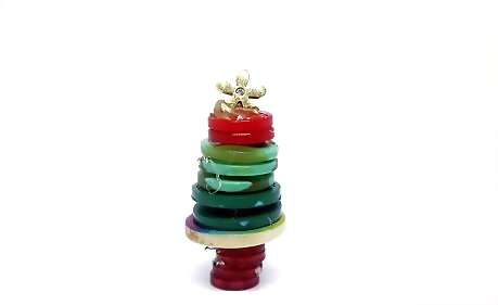 Craft a Christmas tree ornament with buttons and embroidery floss. Cut a long piece of embroidery thread, then slip a needle onto each end. Push each needle through a hole on a stack of small brown buttons. Next, push the needles through a stack of green buttons, starting with the largest and finishing with the smallest. Pull the needles off, then tie the embroidery thread to make a hanging loop. Plan on using 4 to 5 brown buttons, and around 10 to 12 green buttons. The green buttons don't have to be the same shade. You can use a mixture of light, medium, and dark green buttons. Make the knot about 3 inches (7.6 cm) above the last green button. Cut off the excess embroidery floss.