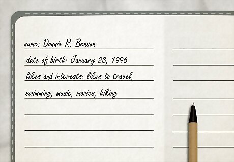 Determine an identity. You don't need to enter very much personal information on Facebook, but you should have a few things in mind: Likes and interests — Draft a list of things your alias is interested in. Hobbies, daily activities, and favorite entertainment should be on your mind. Date of birth — Pick a DOB that correlates with your projected age. Depending on the likes and interests you choose to put on your profile, this will vary. Name — Pick a name that's common enough that it doesn't draw attention but is not so common that it raises suspicion. Avoid common aliases (e.g., "John Smith"). Consider picking a name that was popular during your "birth year" here. Location — To avoid setting off alarms, it's best to choose a location somewhat near where you are actually located. If this is impossible, some people have reported that using a VPN to spoof your location has worked to fend off the Facebook police. For example, if you have a VPN that allows you to set your location to Seattle, you can make your fake account from Seattle and always switch to the Seattle VPN server whenever you want to log in or post as that account.