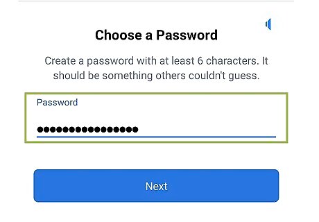 Create a password and tap Next. Tap the "Password" text field, then type the password you want to use. If you're prompted for a verification code, open the email address that you used to create your Facebook account, look for the code in the subject line of the email from Facebook, and enter the code on the Facebook prompt.