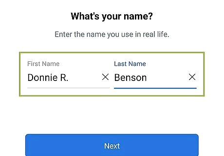 Add your fake first and last name. Tap the "First name" field, type in the profile's fake first name, and then tap the "Last name" field and type in the last name.