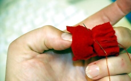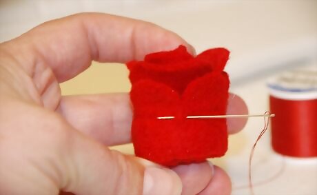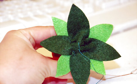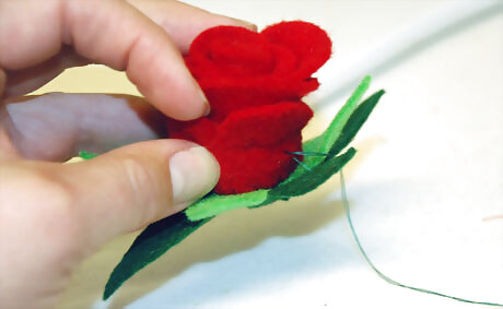 Sew the leaves firmly to the bottom of the felt rosebud, alternating shades of green if you have them.