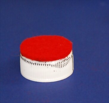 Wrap the large, long scalloped rectangle around the bottle cap and stitch the edge of the rectangle that is not scalloped to the perimeter of the small circle while it’s wrapped around the cap. You can use a gluestick to “tack” the pieces in place temporarily while you stitch if you want. When attached as instructed, the small circle and the rectangle should form a "cup" in which the bottle cap can fit snugly.