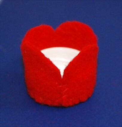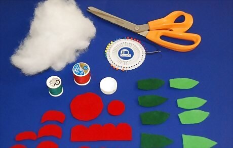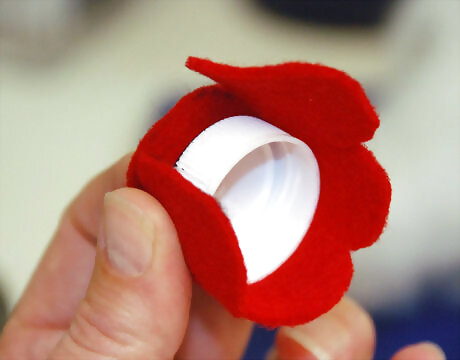 Cut the following shapes from the felt by tracing the outline of a bottle cap and measuring the rest of the pieces against it: Red felt: 1 circle the size of the bottle cap 1 circle approximately twice the diameter of the bottle cap 1 scalloped rectangle that is as long as the bottle cap is around and a little over twice as tall as the bottle cap's size Petal strip 5 additional petals in graduated sizes. Green felt: 4 dark green leaves (approximately 1/4th the width of the red rectangle above) 4 light green leaves (approximately 1/4th the width of the red rectangle above).