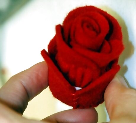 Use a single stitch of matching green thread to "tack" the four bottom leaves lightly to the sides of the rosebud to lift the leaves a little and give it a more "natural" look. Finrose1.jpg