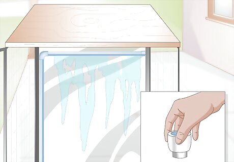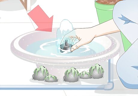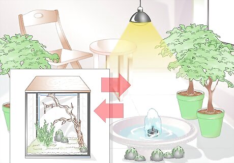 Install necessary plumbing. If you want to include a drip wall or stream in your habitat, you’ll need to connect the bottom of your tank (where the water accumulates under your false bottom) with return lines to your drip wall. If you have any questions about what you need, talk to your local pet store or lizard store proprietor for advice. Connect your water system to a reverse osmosis machine. These machines will dissolve salts and other impurities from the water, and will help you avoid mineral deposits on your habitat. They will also prevent potential skin problems with your chameleon. Connect a small sump pump to the water beneath the habitat. If you do not include a pump system, you’ll need to mist the vivarium with a spray bottle twice each day for about thirty seconds each time.