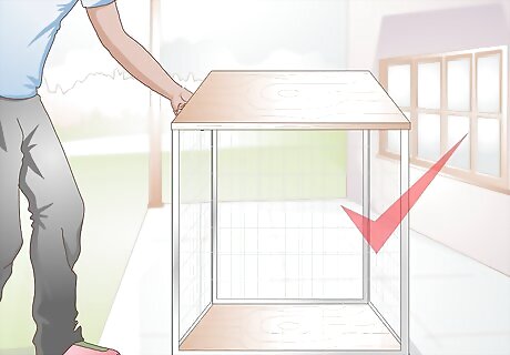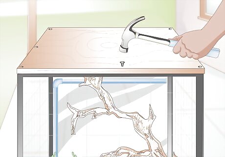 Put a top on it. In order to keep your chameleon from escaping and getting into trouble, you’ll have to secure the terrarium with a lid. In the case of aquarium tanks, you need to strike a balance between keeping the environment humid -- which chameleons love -- and having it so humid that the vivarium’s interior is obscured by moisture on the glass. An easy solution is to keep only a thin strip of the top open to the air. This strip should be of fine screen or wire. This way, fresh air will flow through the cage, but it will still stay relatively toasty within.