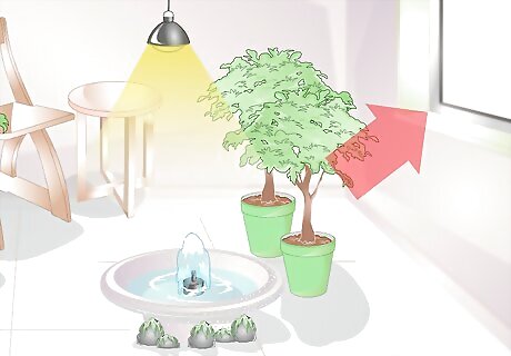 Provide a temperature gradient. The room should include a 75-100-watt incandescent bulb or heat lamp to provide at least one area where the chameleon can warm up to a toasty 92-94 degrees Fahrenheit. On the low end, provide a shaded space away from the windows where the chameleons can cool down to around 75-82 degrees Fahrenheit. By providing a range of distinct temperature zones within the room, your chameleon will be able to select a comfortable temperature for itself. Place an incandescent bulb or heat lamp near the top of a climbable tree or perch to prevent burns.