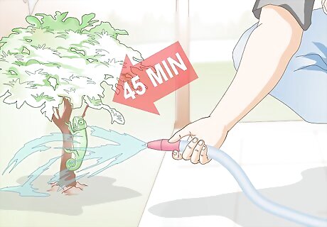 Bathe your chameleon. If you don’t want to get so extensive that you rewire your home’s plumbing and give up an entire room, you could satisfy your chameleon’s sanitary and water needs another way. Put your chameleon on a small tree (a fig tree would work nicely) and place the tree/chameleon combo in the mist for about 30-45 minutes every other day. Set the water to a lukewarm temperature. This will give the chameleon the opportunity to bathe, defecate, and drink water. Let the tree and chameleon get relatively dry, then move them back into the free-range room.
