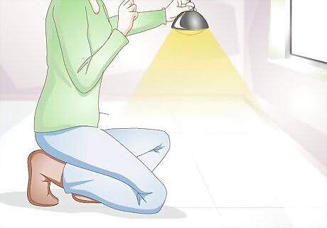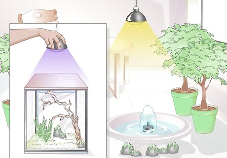 Add an artificial light. Chameleons need a basking bulb to stay healthy. If your chameleon cannot be housed in a room with natural light, you'll need to provide an artificial ultraviolet light as well. Install both ultraviolet and basking bulbs outside and on top of the cage, or in a location where the chameleon can easily access them if it is housed in a free-range habitat. In the natural world, chameleons get ultraviolet light naturally. Ultraviolet light helps them digest food properly. The basking bulb, on the other hand, helps chameleons regulate their body temperature. Ensure you place a climbable object (a rock, tree, or stable branch) close to the basking bulb so the lizard can access it. Ultraviolet lights need to be changed every six months, even if they still provide visible light. They lose their ultraviolet properties over time. Turn off all lights at night.