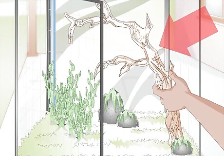 Add a natural touch. A few faux rocks, artificial plants (or real plants), and vines will make your vivarium comfortable for your chameleon. Attach driftwood and faux rocks to the back of the tank with silicone binder. Including plants in the layout is crucial for your chameleon. Chameleons prefer to drink from leaves, so you must spray the leaves at least twice a day to ensure the chameleon stays hydrated.