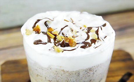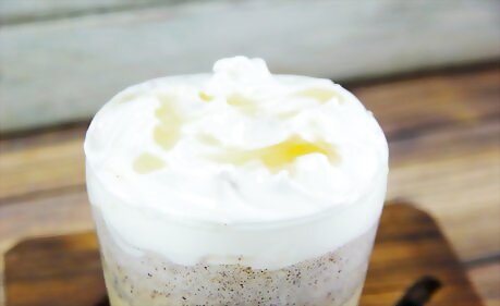Garnish the milkshake with whipped cream and caramel syrup.