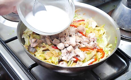 Prepare a slurry. A slurry is a mixture of water and a thickening agent. For a stir fry, a slurry should be a combination of water and cornstarch. For each person, combine 1/2 cup (120 ml) of water with 1 tbsp. (15 ml) of cornstarch. Stir well until combined. Set aside until the last step of cooking.