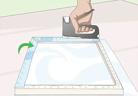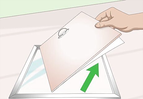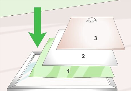 Cover the backing. Place the fabric or wrapping paper wrong side up on a flat surface. Position the cardboard insert or original backing in the center. Fold the extra material over the insert/backing and attach it to the back with tape.