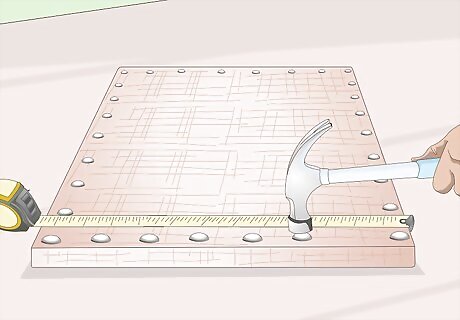Hammer in the upholstery tacks to the front of the board. The upholstery tacks will form a decorative edge around your memory board. You must position them over the wooden frame. Use a measuring tape and pencil to mark the location of each upholstery tack—the distance between the tacks is up to you. Hammer each tack into place.