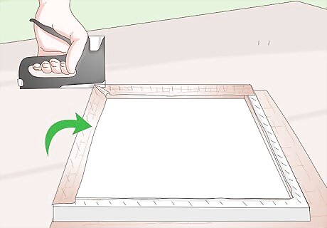 Attach the fabric to the canvas. Lay your fabric wrong side up on a flat work space. Place your canvas face down in the center of the fabric. Pull one edge of the fabric up and over the wooden frame. Insert a line of staples down the entire edge of the frame. Repeat on the three remaining sides.