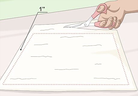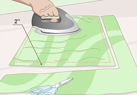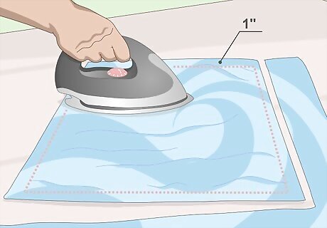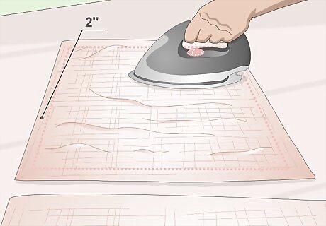 Iron and cut the fabric. Run a warm iron over your fabric to remove any creases or wrinkles. Lay your pressed fabric on a flat work space. Measure, mark, and cut the fabric so that each edge is 1 inch (2.54 cm) longer than the corresponding dimensions of the canvas.
