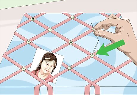 Sew on buttons where the ribbons cross. To prevent the ribbons from moving, sew a button at each point where the ribbons cross. Flip the canvas over. You will see a knot of thread where you attached a button. To prevent these knots for slipping, place a dab of hot glue onto each knot. This will prevent the knots from unraveling. Once the hot glue is dry, you can start adding memories to your board.