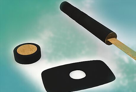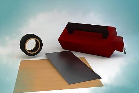 Get your materials. You'll need a sheet of 1/4" flat stock aluminum, a band saw or jigsaw, a metal file, a piece of plywood, a 1-1.5" diameter dowel rod, electrical tape or ribbon, and metal glue or epoxy.