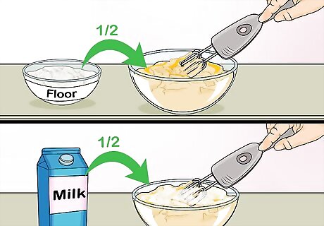 Alternate between adding the flour and the milk to the butter. Pour in half of the flour mixture into the butter mixture. Beat to combine, then stir in half of the milk. Repeat with the rest of the flour and milk. Stir everything together until they are just combined.
