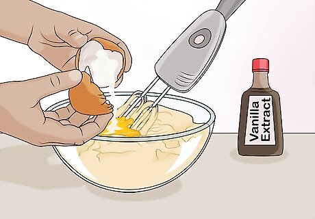 Add in the eggs, then stir in the vanilla extract. Add the eggs in one at a time. Beat the mixture well after each egg that you add. At the very end, stir in the vanilla extract.