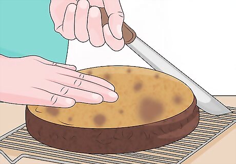 Cut the top part off of each cake, if needed. Sometimes, cakes form a dome on top while baking. If your cakes formed domes, use a long, sharp knife to cut them off. Discard the cut-off domes or eat them.