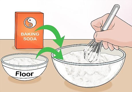Whisk the flour and baking powder together. Pour the flour into a large mixing bowl. Add the baking powder. Stir the two together with a whisk.