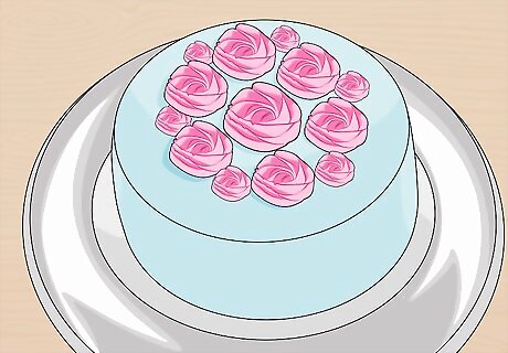 Pipe a tight circle onto the cake to make a simple rose. Place the tip of the bag against the center of the cake. Using gentle pressure, begin piping out frosting while moving the bag outward in a circle. Think of it as drawing a tight spiral. For a simpler cake: plop icing on top, then use cake decorating spatula to spread it towards the edges and down the sides.
